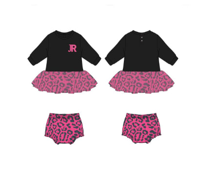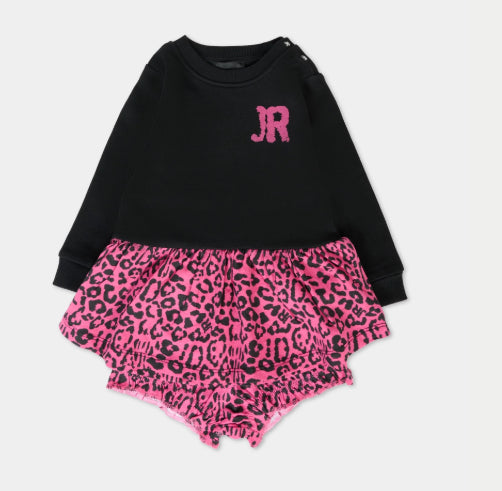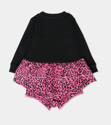 Abito con corpo in felpa con patch logo e gonna in tulle stampato con spotted allover. Culotte in jersey stampato con spotted allover con elastico al punto vita.