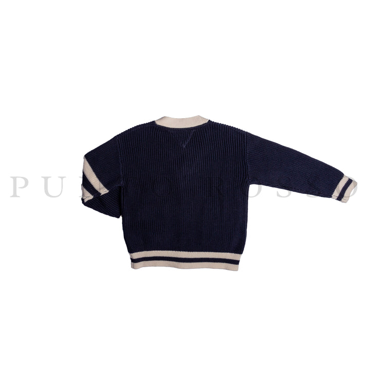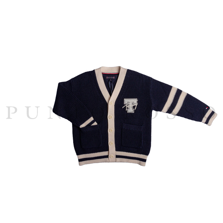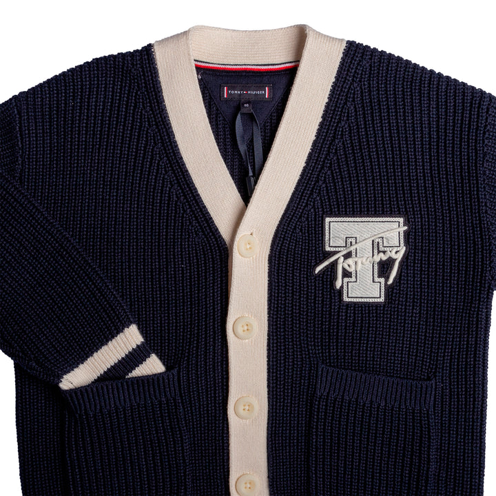 Il cardigan in cotone, con la classica scollatura a V a contrasto e l'iconico logo in stile college, è la soluzione ideale per le giornate più fredde.
