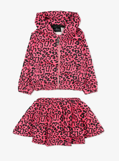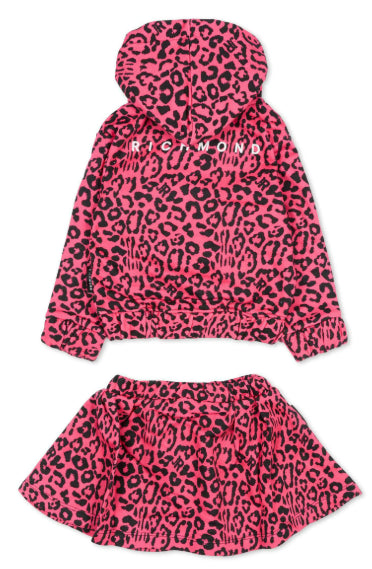 Coordinato in felpa stampata con spotted allover composto da felpa con cappuccio, zip in metallo e stampa sul dietro e gonna con elastico al punto vita.