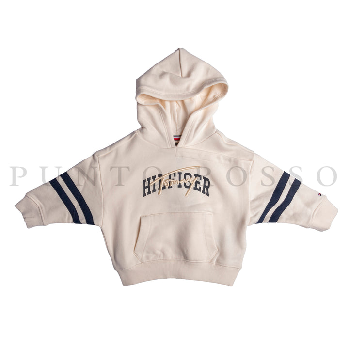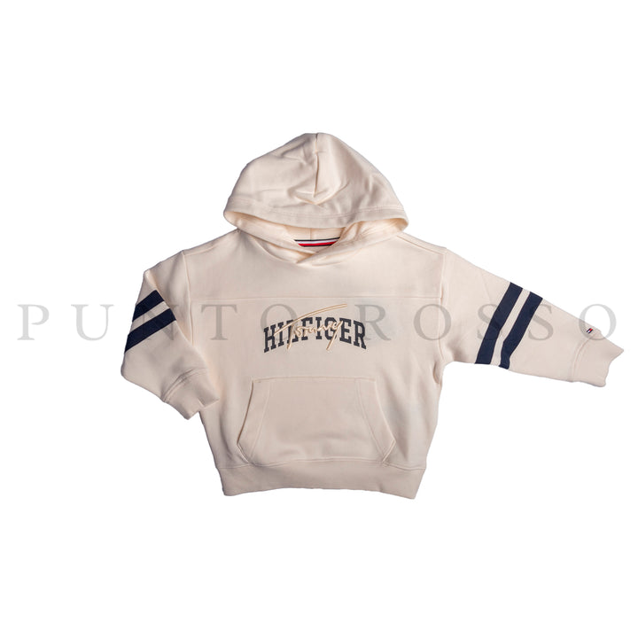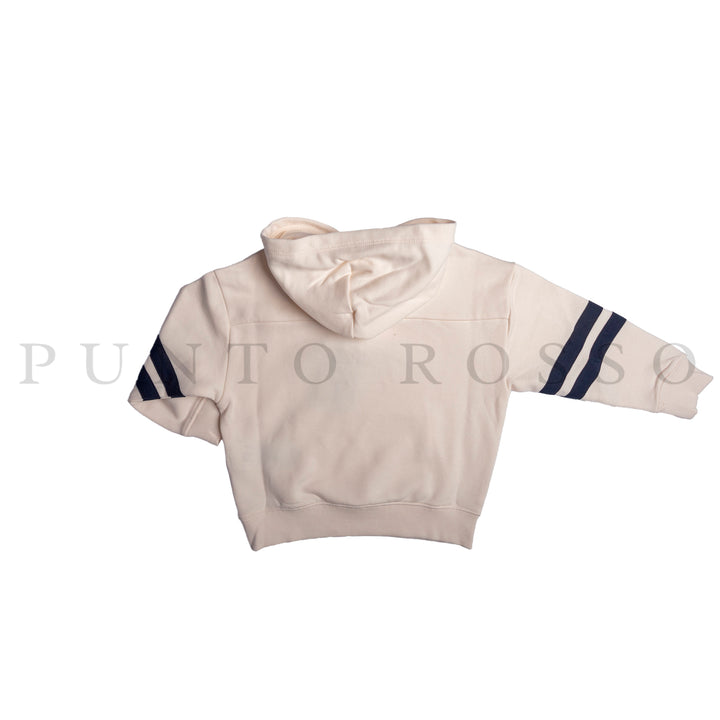 La felpa in puro cotone, con pratico cappuccio, si distingue per il mix di loghi in versione ricamata e grafica sul petto e per le righe sportive sulle maniche.