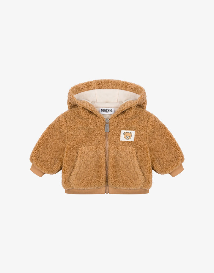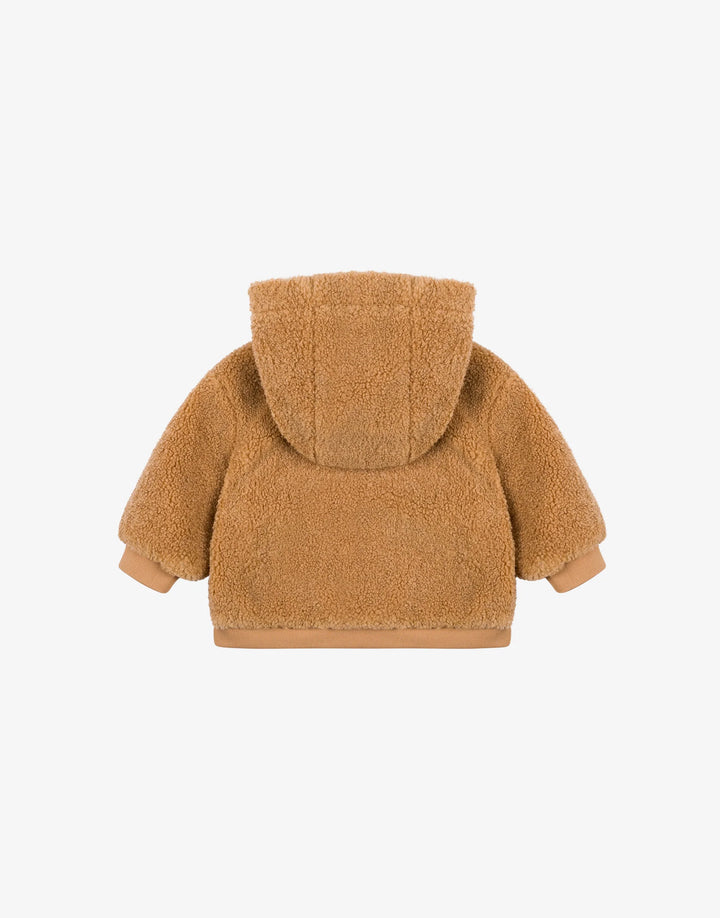 Ecopelliccia marrone del brand Moschino Kids, in tessuto teddy, a maniche lunghe, con cappuccio, chiusura frontale con zip, tasche laterali, polsini e orlo a costine. È decorata con patch con Teddy bear sul petto.