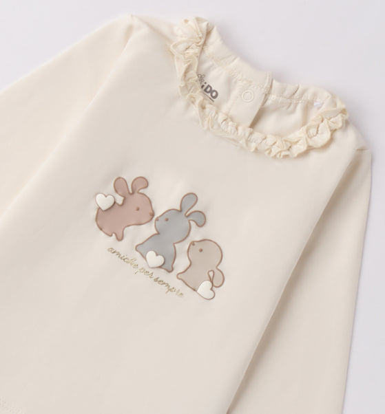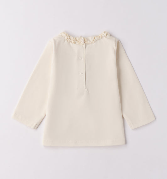 Maglietta per bimba iDO 1-36 mesi realizzata in jersey stretch, manopesca. Il modello presenta apertura sul retro con bottoni a pressione per agevolare il cambio e la vestizione. Girocollo con ruches.
