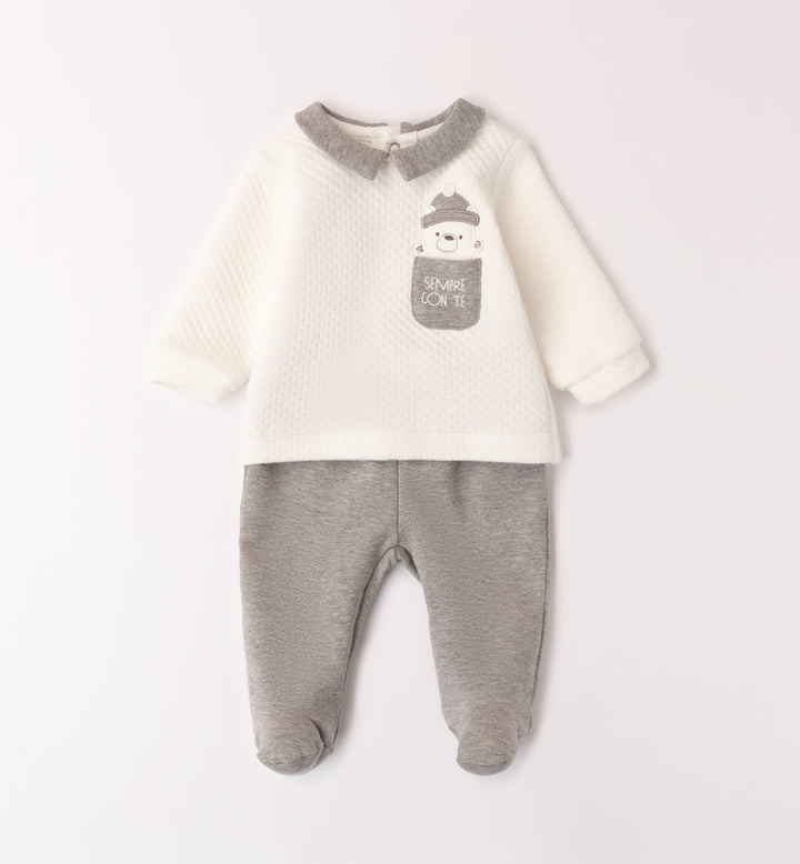 Tutina due pezzi con piede per neonato iDO in cotone invernale. L'articolo presenta l'apertura sul retro con bottoni a pressione per agevolare il cambio e la vestizione. I pantaloni sono felpati internamente ed in fantasia tinta unita.