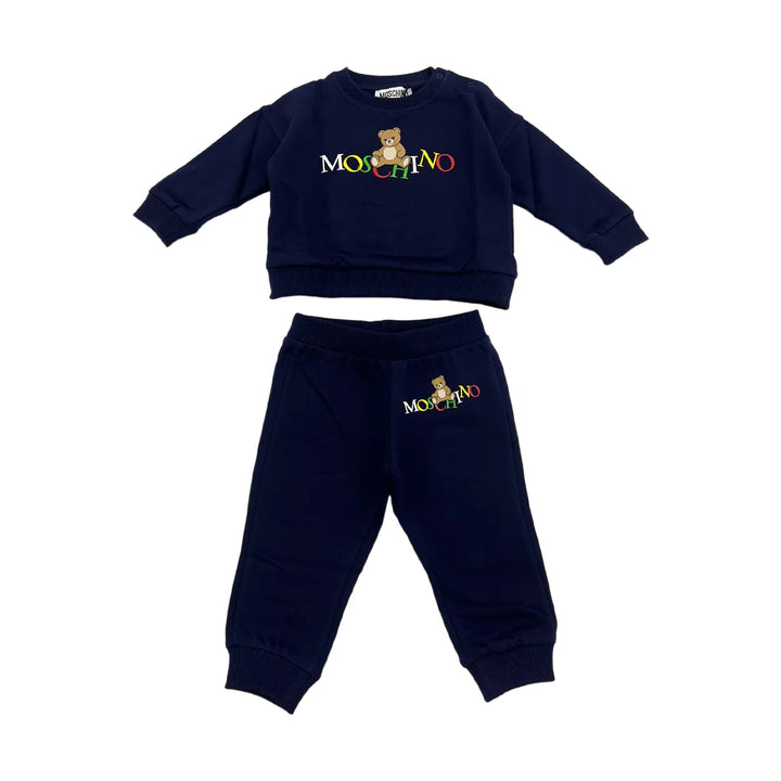Tuta Moschino comoda e giocosa, composta da felpa con logo frontale e pantalone con vita elasticizzata. Il design accattivante e i dettagli morbidi la rendono perfetta per momenti di gioco o relax con stile.