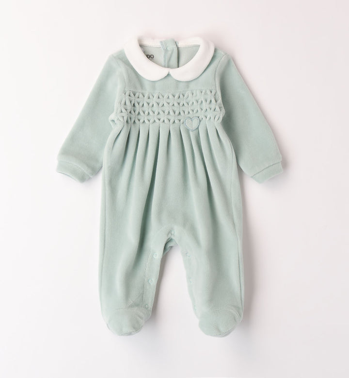Tutina per neonata iDO 0-18 mesi in ciniglia. Il modello presenta apertura sul retro e nel sottogamba con bottoni a pressione per agevolare il cambio e la vestizione.