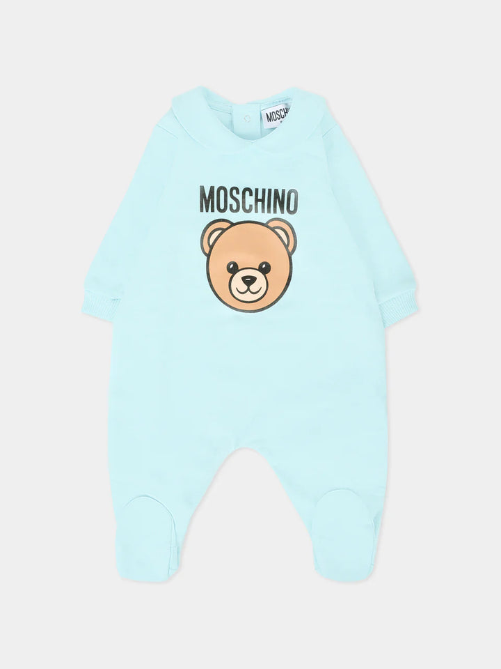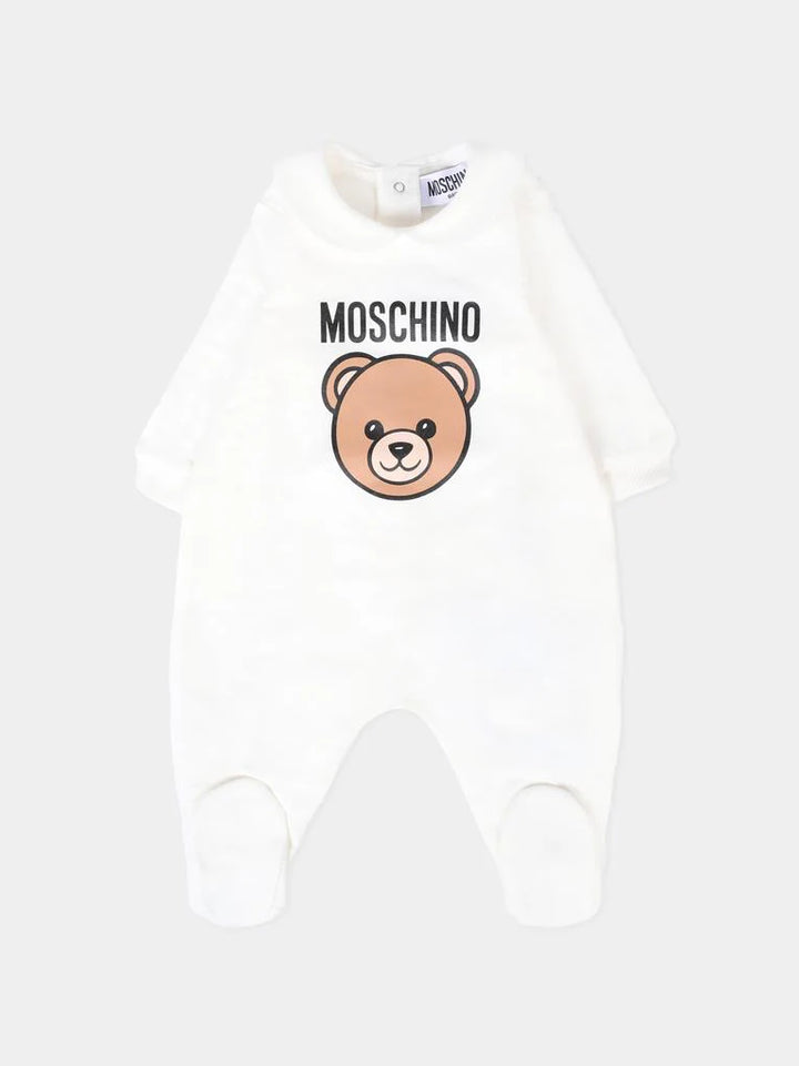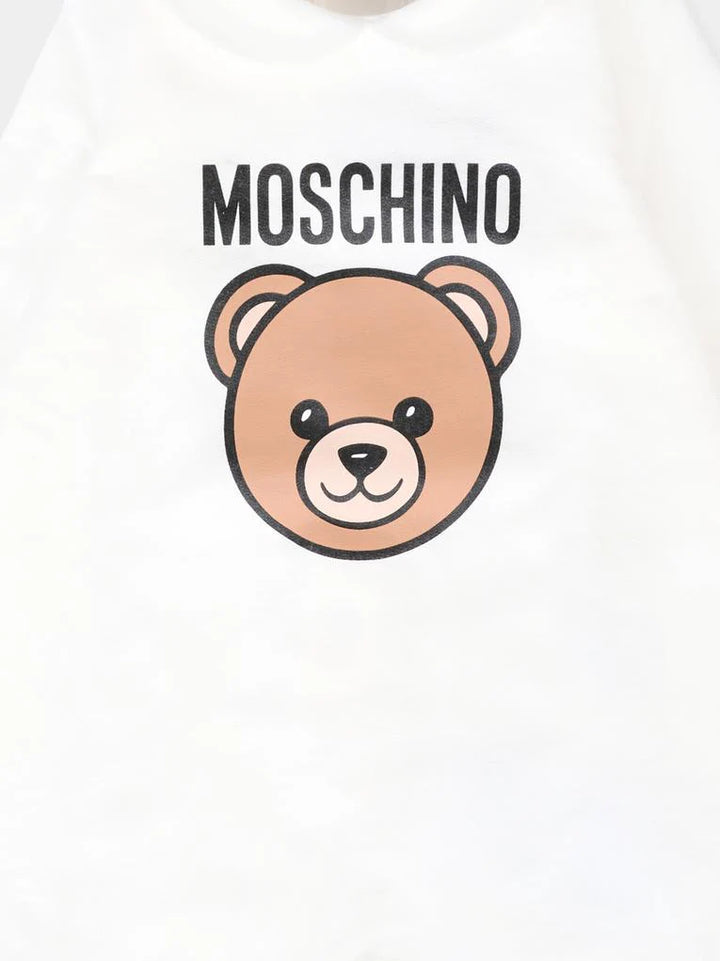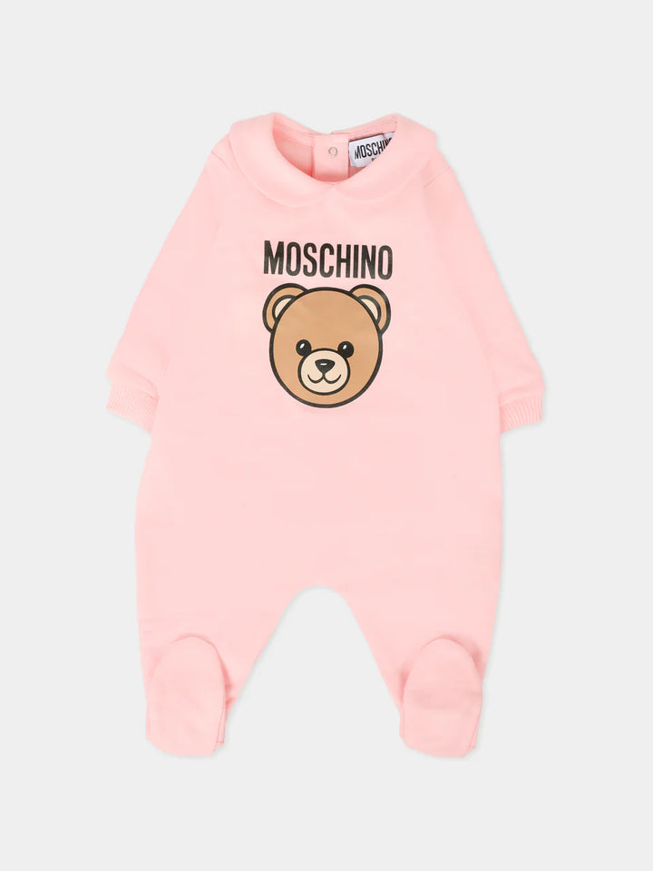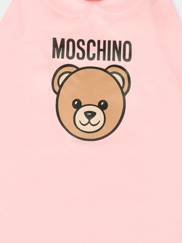 Tutina rosa del brand Moschino Kids, realizzata in cotone felpato, con maniche lunghe, colletto peter pan, piedini e chiusura con bottoni automatici sul retro. È decorata con Teddy Bear e logo sul davanti.