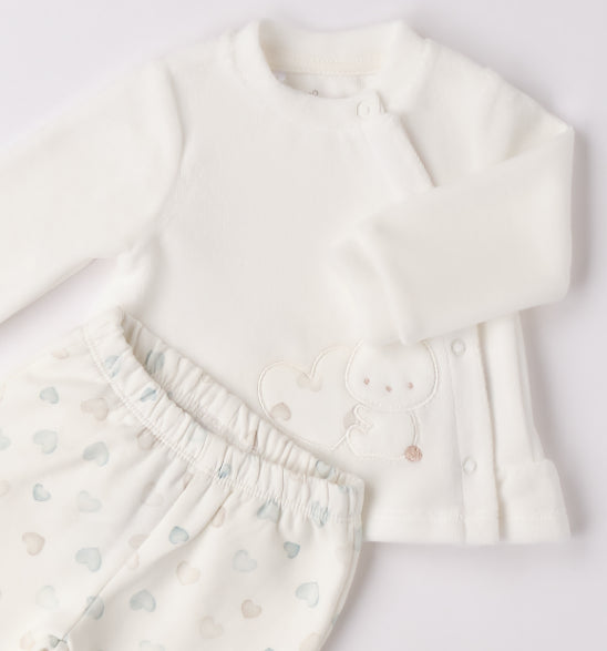 Tutina due pezzi con piede per neonata iDO in ciniglia. L'articolo presenta apertura davanti con bottoni a pressione per agevolare il cambio e la vestizione. La ghettina è in fantasia all over.