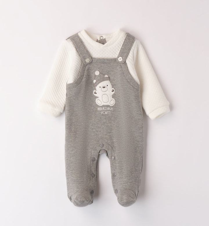 Tutina per neonato iDO 0-18 mesi in felpa invernale. Modello finta salopette con maniche a contrasto. Il modello presenta apertura sul retro e nel sottogamba con bottoni a pressione per agevolare il cambio e la vestizione.